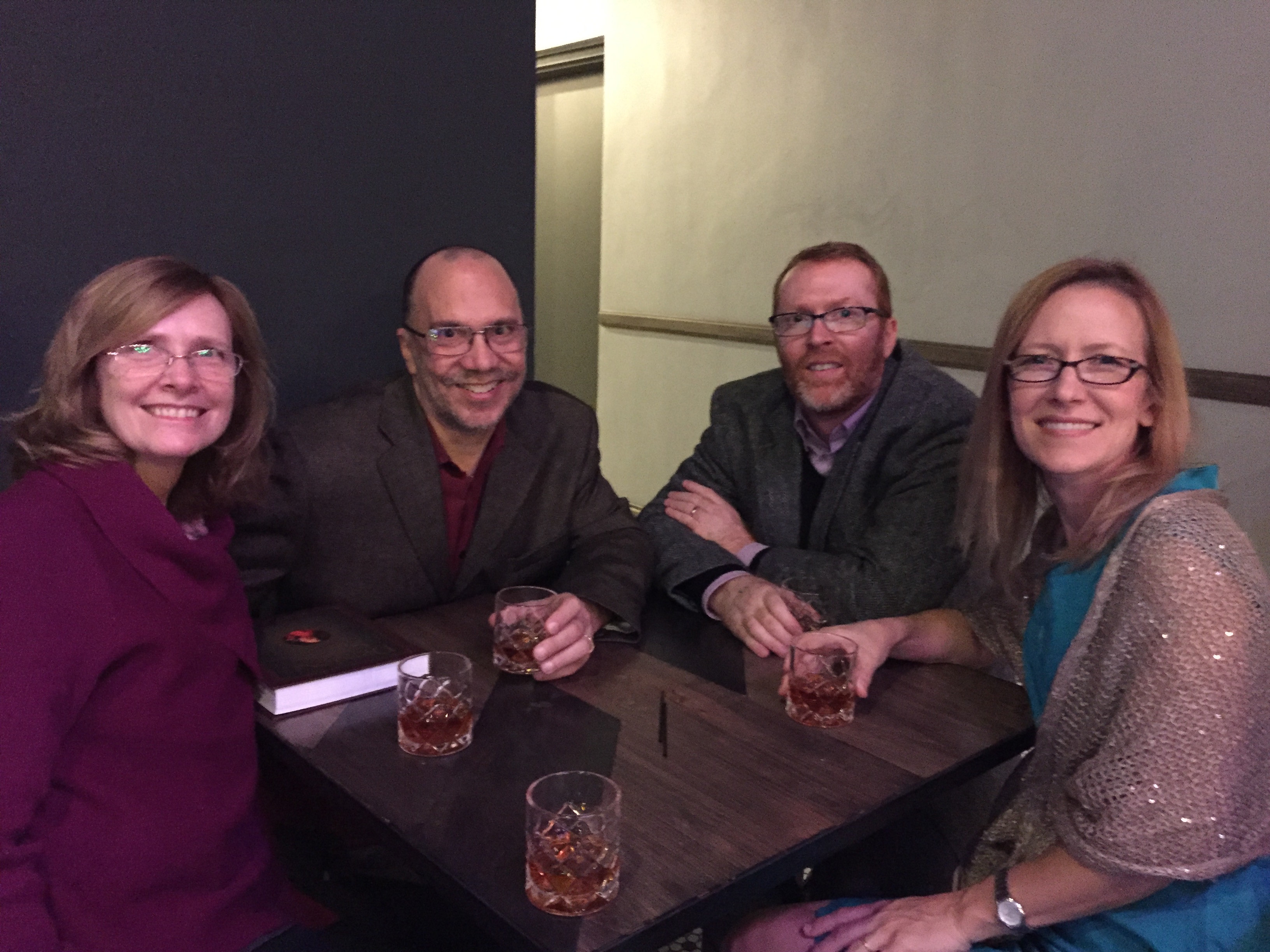 Next stop was Dichotomy Coffee and Spirits on Austin Avenue, where manager Andrew Anderson served us a delicious San Diego cocktail in honor of another feast day that falls on November 13, that of Saint Diego. I said a few more words about the book, and owner Alina Mikos told us a little about Dichotomy’s unique double commitment to fine coffee and fine spirits. Here is some of the Progressive Gang at Dichotomy: